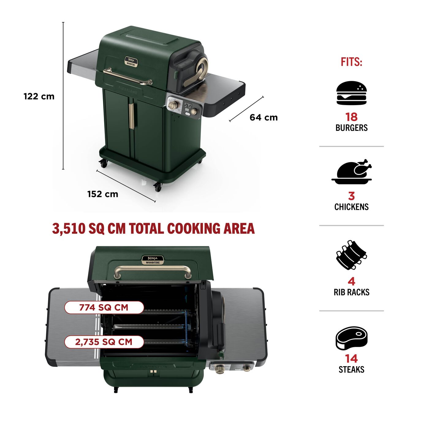 FlexFlame is an all-in-one barbeque smoker, roaster, grill, flat plate griddle, and pizza-maker. With generous dimensions of 151.31cm (L) x 63.7cm (W) x 122.71cm (H), the Ninja FlexFlame offers ample cooking space without overwhelming your outdoor area.