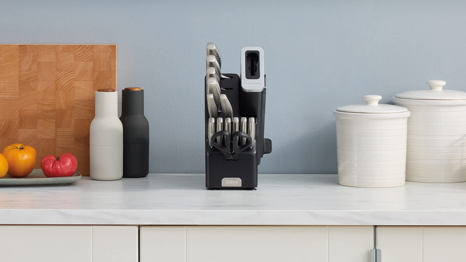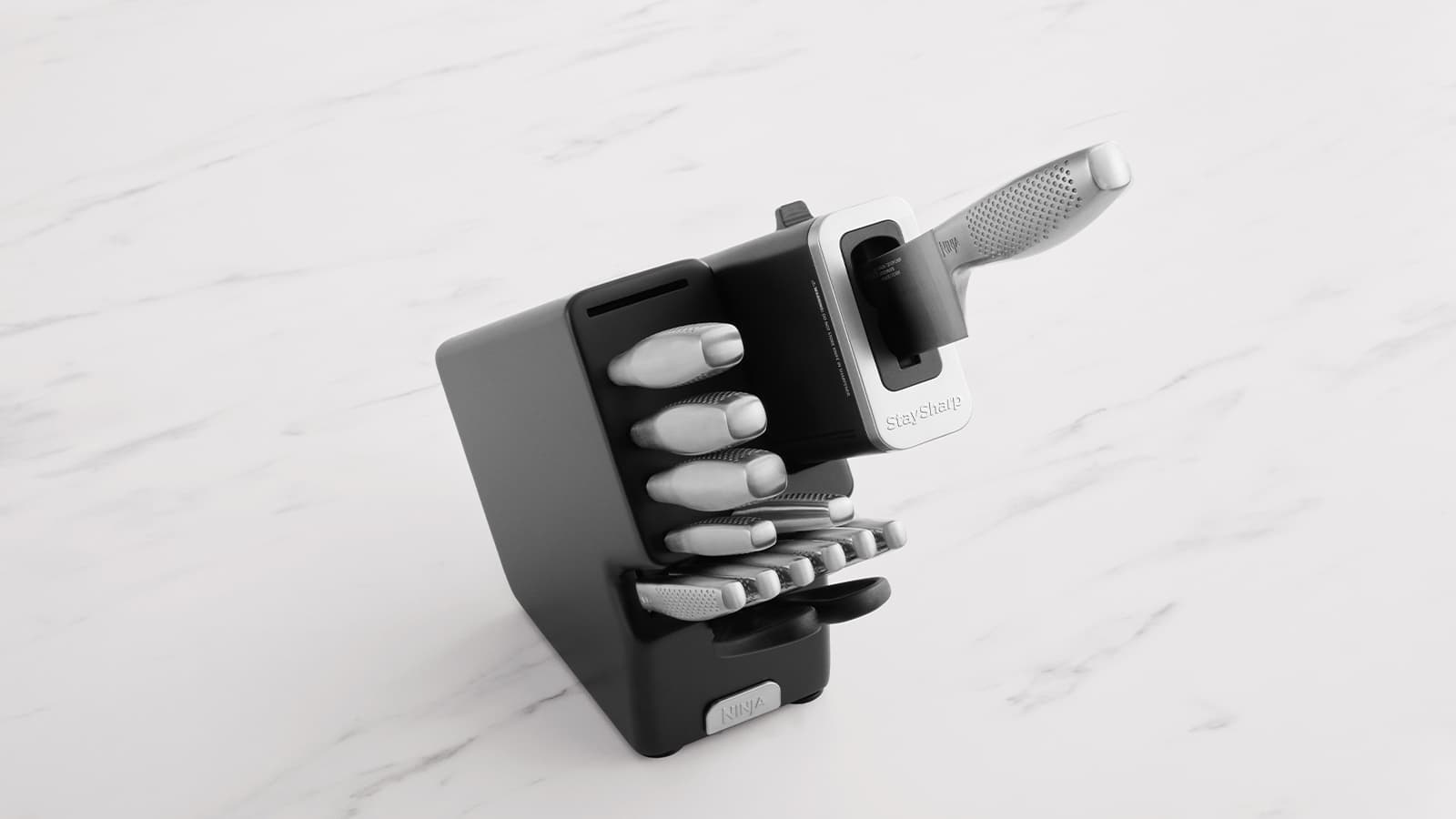 Suction cups underneath the block also keep it firmly in place when sharpening or removing knives. All Ninja StaySharp knives should be hand washed to maintain their sharpness and luster.