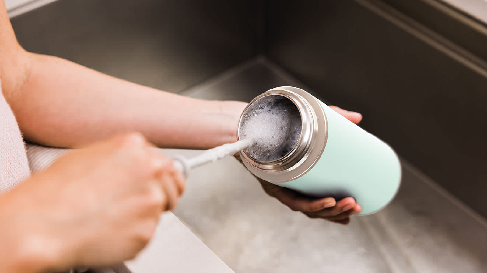 Place your travel bottle in the dishwasher when it needs a clean. To keep it in tip top shape, hand wash it with warm, soapy water. You can even remove and handwash the gaskets from the lid for a deeper clean.