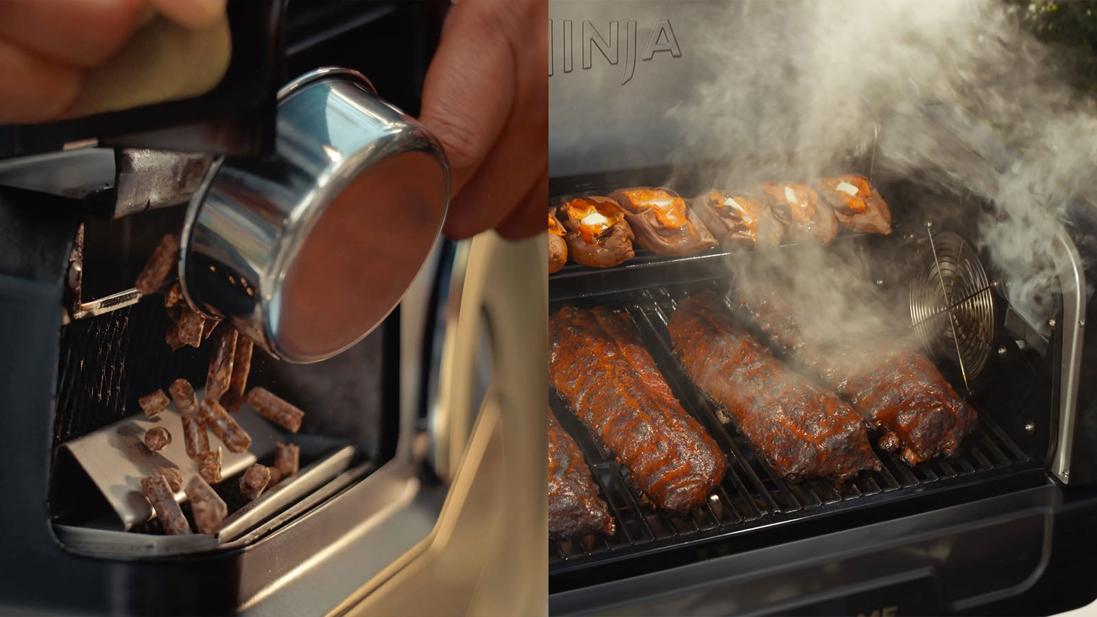 - Includes: FlexFlame ProConnect Cooking System, 2x Porcelain Enamel Cast Iron Grill Grates, Expandable Roast & Smoke Rack, Grease Tray, Removeable Pellet Box & Ninja Woodfire Pellets Sample Bag.