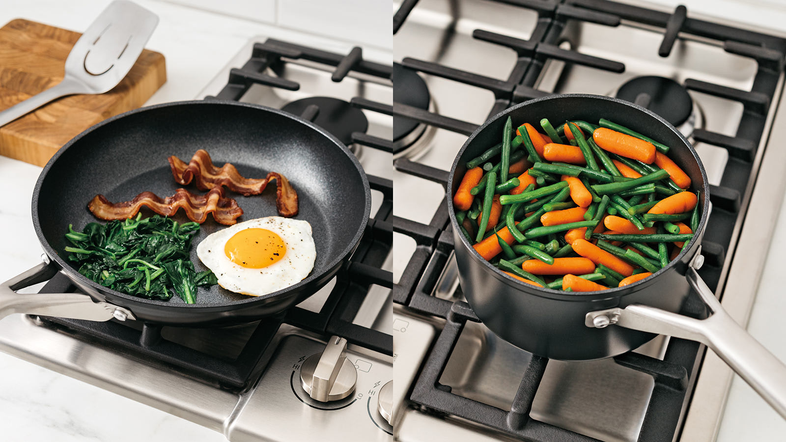 Built to last: The Essentials collection is made from forged aluminium with a smooth exterior and stainless steel handles that are comfortable to hold.